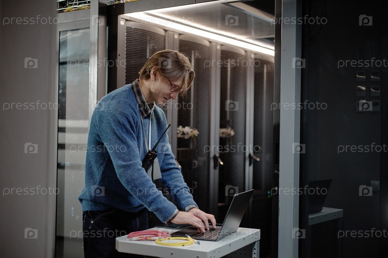 Кавказский мужчина средних лет работает на ноутбуке в современной серверной комнате