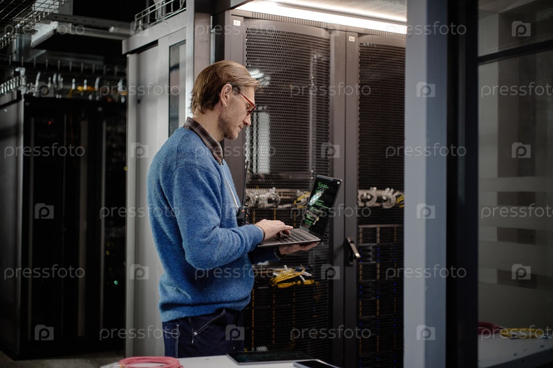 Кавказский мужчина среднего возраста, использующий ноутбук во время мониторинга оборудования серверной комнаты