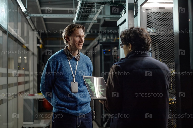 Кавказский мужчина средних лет обсуждает безопасность данных с молодым взрослым человеком