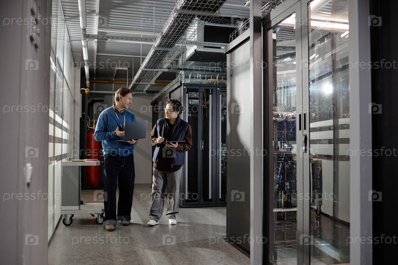 Кавказ среднего возраста и азиатский мужчина сотрудничают в коридоре центра обработки данных