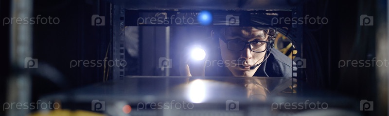 Молодой взрослый азиатский мужчина, носящий гарнитуру, осматривает стойку сервера с фонариком