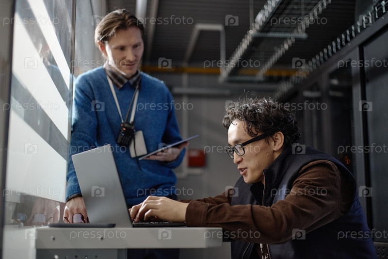 Белый мужчина и молодой азиатский человек сотрудничают на ноутбуке в серверной комнате