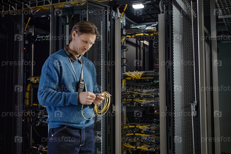Кавказский мужчина средних лет проверяет сетевые кабели в серверной комнате