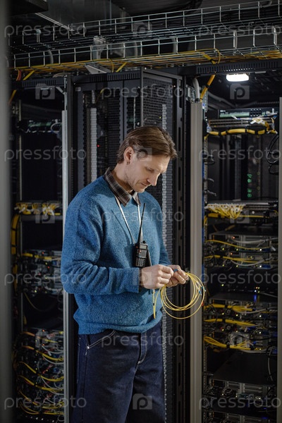 Кавказский взрослый мужчина проверяет сетевые кабели в серверной комнате центра обработки данных