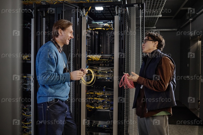 Кавказский мужчина и молодой взрослый обсуждают сетевые кабели в серверной комнате