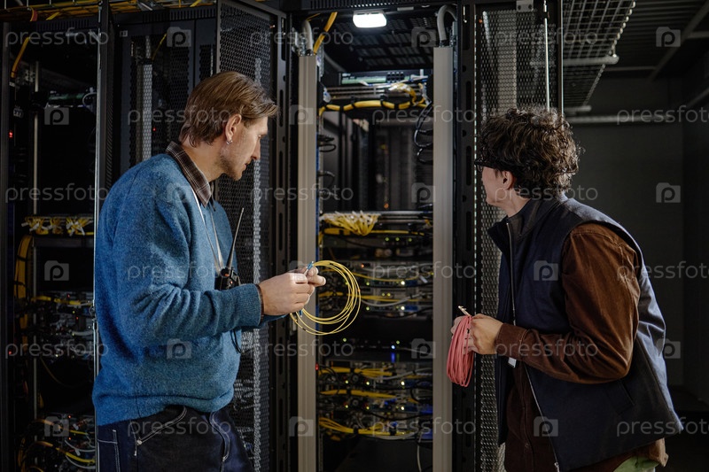 Мужчины среднего возраста проверяют сетевые кабели в серверной комнате