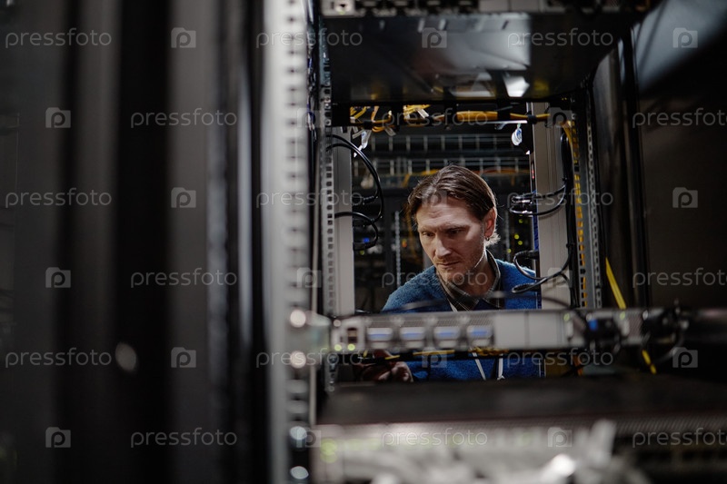 Взрослый белокожий мужчина работает внутри серверной стойки в комнате ЦОД