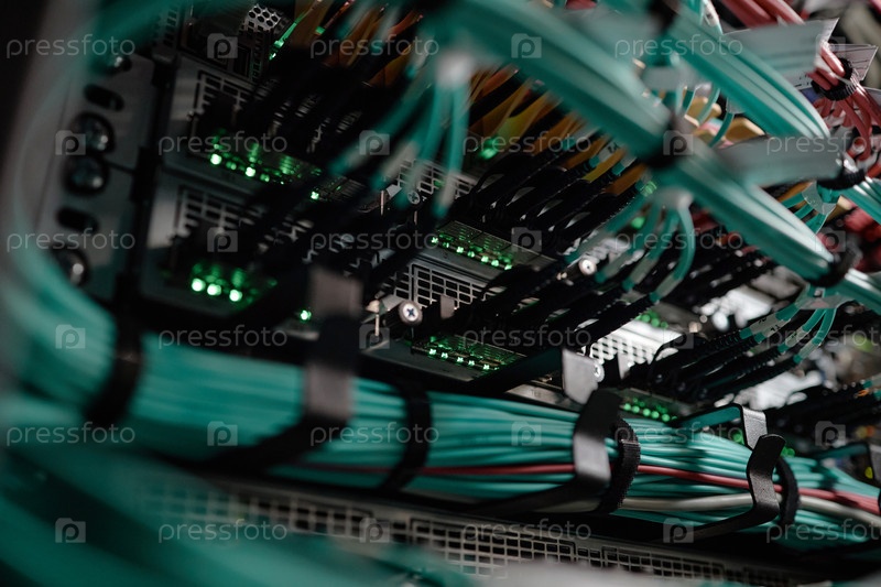 Сетевые кабели и серверное оборудование передают данные в современном центре обработки данных