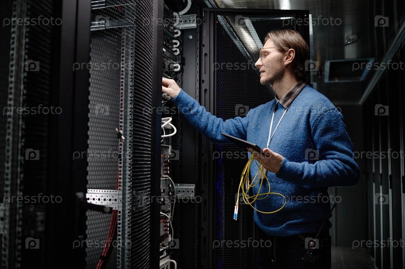 Кавказский взрослый мужчина Управление серверным оборудованием в центре обработки данных