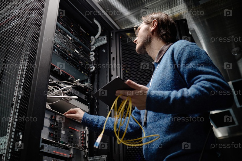 Кавказский мужчина управляет серверным оборудованием в комнате центра обработки данных для взрослых