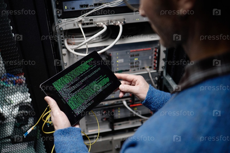 Кавказский мужчина средних лет использует планшет, работая в серверной комнате