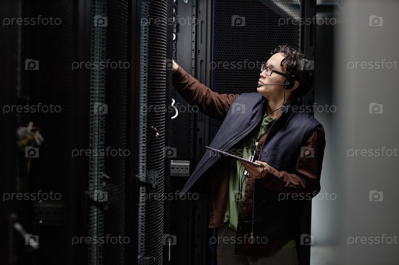 Молодой взрослый азиатский мужчина осматривает стойку серверов, держа цифровой планшет