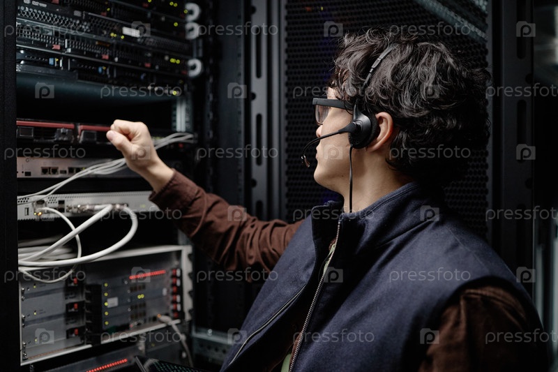 Молодой взрослый мужчина работает в серверной комнате, носящий гарнитуру и жилет
