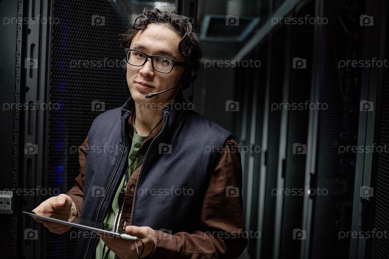 Портрет молодого взрослого азиатского мужчины, работающего с планшетом в серверной комнате