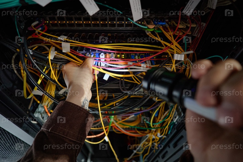 Молодой взрослый мужчина ремонтирует сетевые кабели в серверной комнате