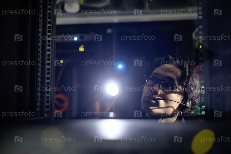 Молодой взрослый азиатский мужчина проверяет стойку серверов с фонариком в центре обработки данных
