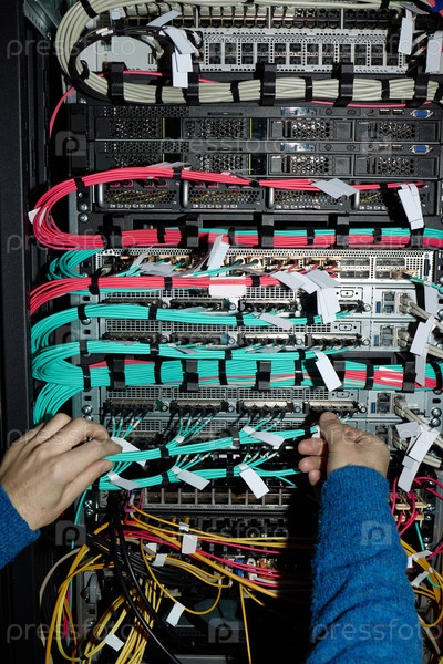 Непризнанный человек настраивает сетевые кабели в серверной стойке центра обработки данных