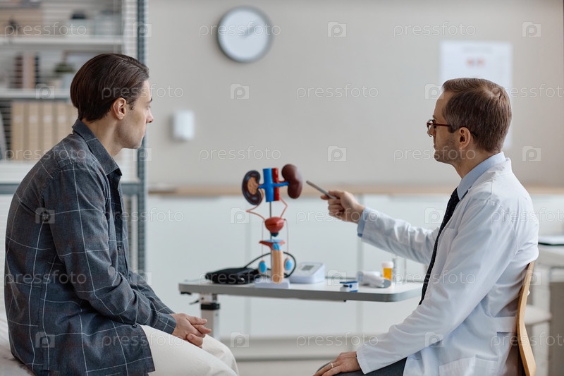Кавказский уролог среднего возраста, объясняющий модели мочевой системы пациенту