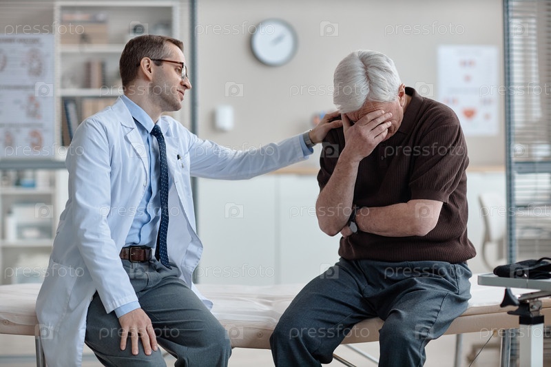 Кавказский уролог утешает опечаленного старшего кавказского мужчину в клинике
