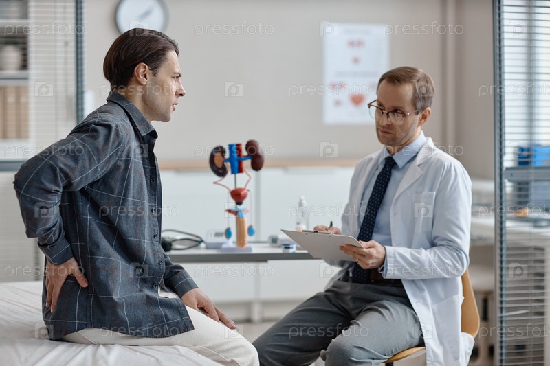 Кавказский мужчина консультирует уролога врача о боли в спине