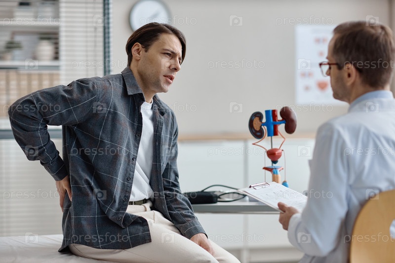 Кавказский молодой взрослый мужчина консультирует уролога о боли в пояснице