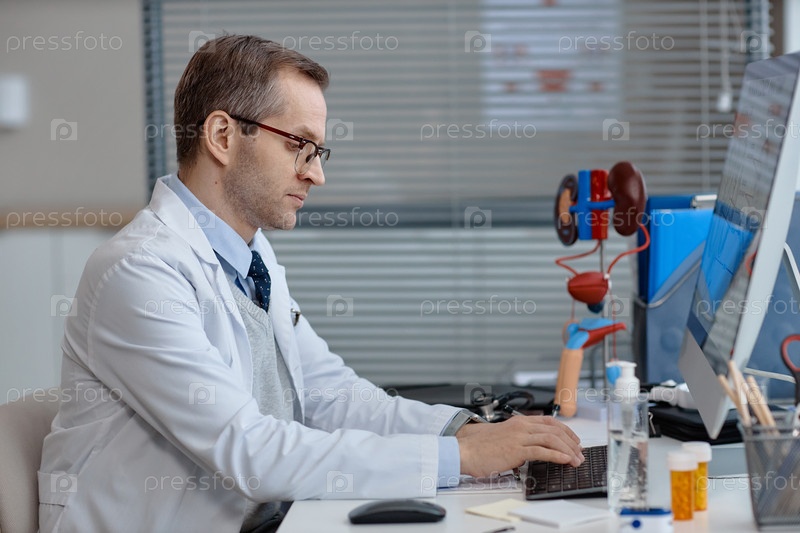 Кавказский уролог среднего возраста, работающий за столом с анатомической моделью