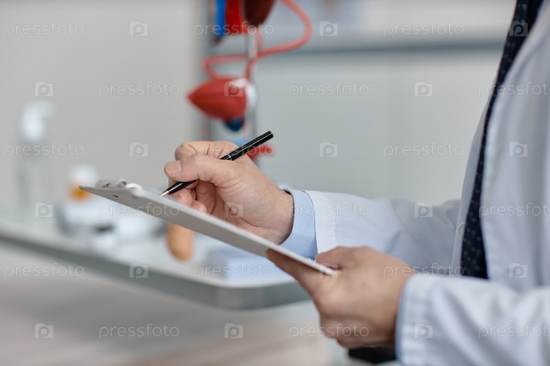Кавказский мужчина среднего возраста, уролог, пишущий записки во время медицинского осмотра