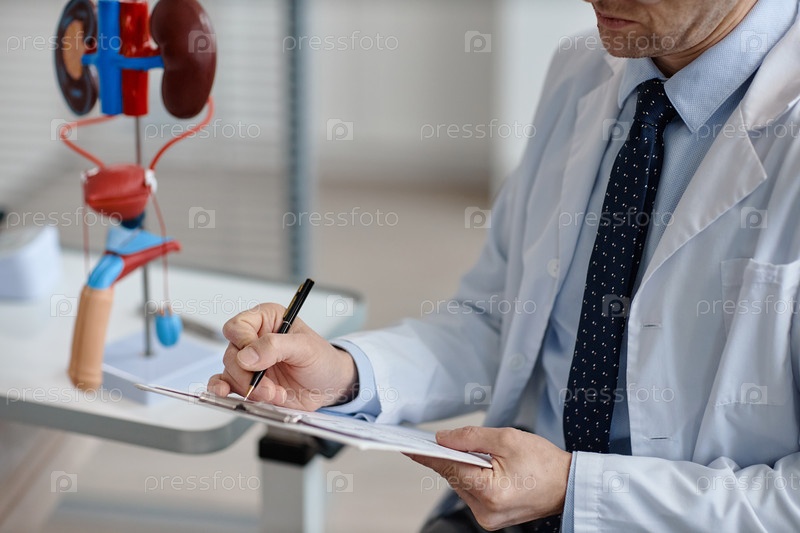 Кавказский мужчина среднего возраста, уролог, пишущий медицинские записки в кабинете клиники