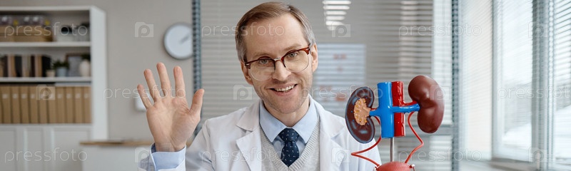 Портрет кавказского мужчины средних лет Уролог, машущий в медицинском кабинете