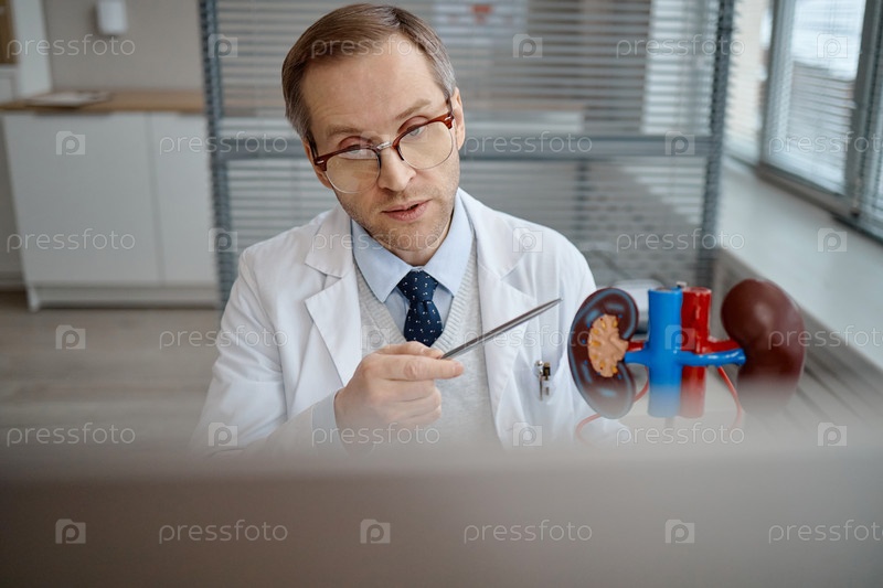 Уролог среднего возраста кавказского пола, объясняющий модель анатомии почек