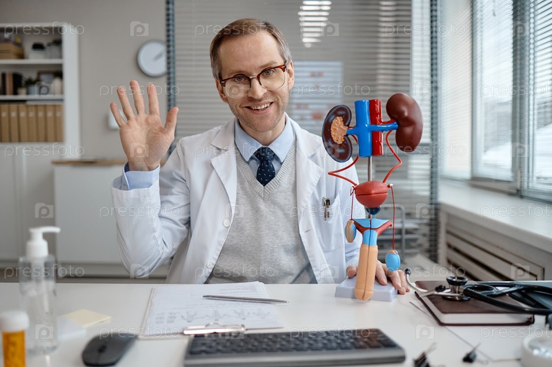 Портрет кавказского мужчины средних лет Уролог машет рукой во время консультации