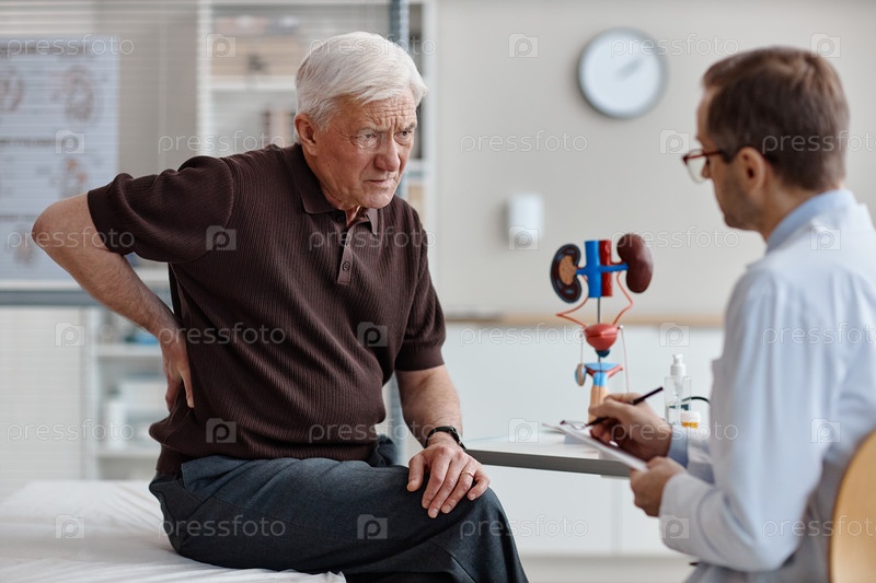 Старший кавказский мужчина консультирует уролога о здоровье почек в клинике