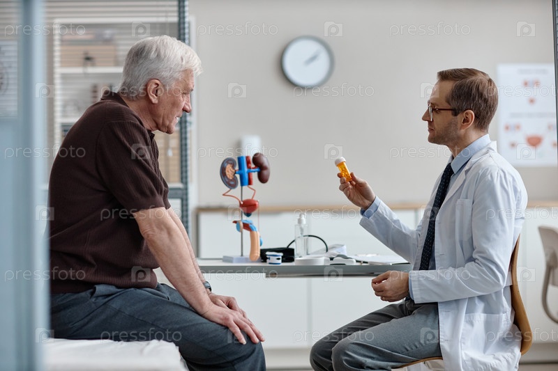 Кавказский старший мужчина Консультация Мужской уролог Обсуждение рецепта лекарств