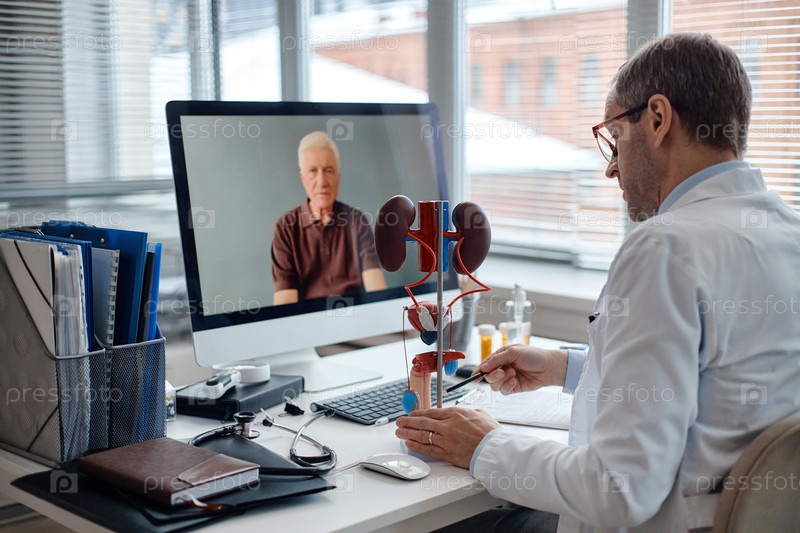 Кавказский уролог среднего возраста консультирует старшего кавказского мужчину онлайн