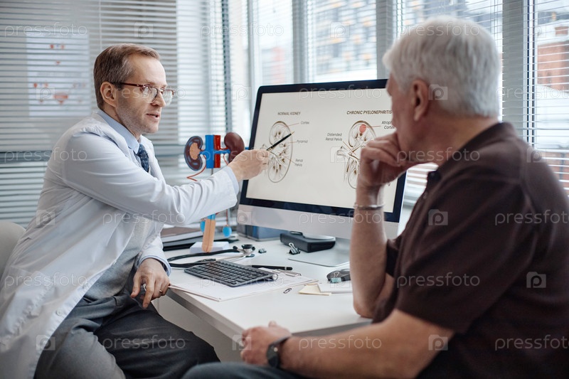 Кавказский мужчина-уролог объясняет состояние почек старшему белому человеку