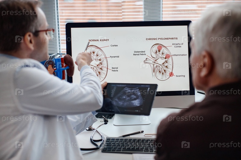 Кавказский уролог среднего возраста объясняет состояние почек пожилому человеку