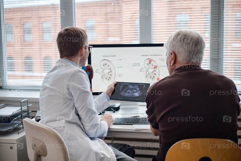Кавказский уролог среднего возраста показывает результаты УЗИ пожилому человеку