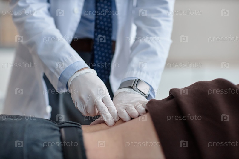 Уролог, осматривающий брюшную полость мужского пациента Мужчина