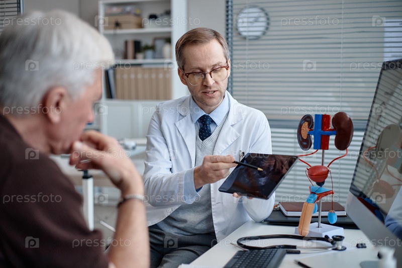 Кавказский уролог среднего возраста объясняет диагноз старшему мужчине