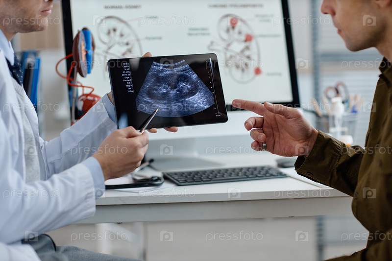 Кавказский мужчина среднего возраста консультируется с урологом, который рассматривает результаты УЗИ