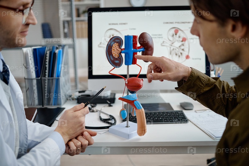 Кавказский мужчина среднего возраста консультируется с урологом Обсуждает модель мочевой системы
