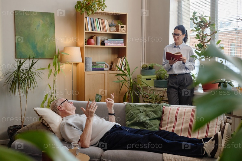 Старший белый мужчина лежит на диване и обсуждает проблемы с молодой взрослой женщиной