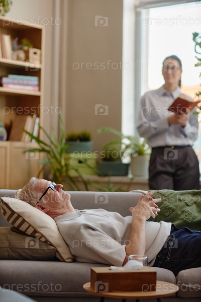 Старший белый мужчина лежит на диване и проходит психологическую консультацию