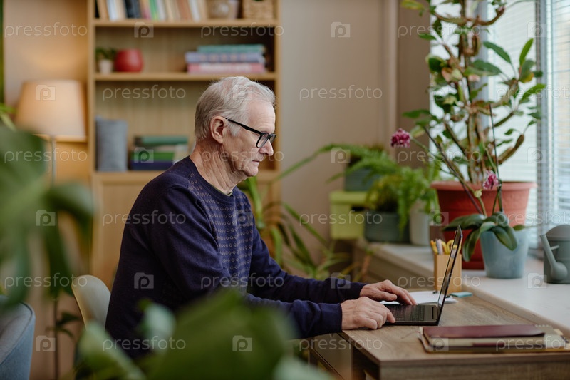 Старший кавказский мужчина использует ноутбук во время работы над психологическими исследованиями