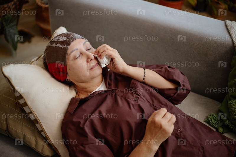 Среднего возраста азиатская женщина лежит на диване, плачет и испытывает печаль