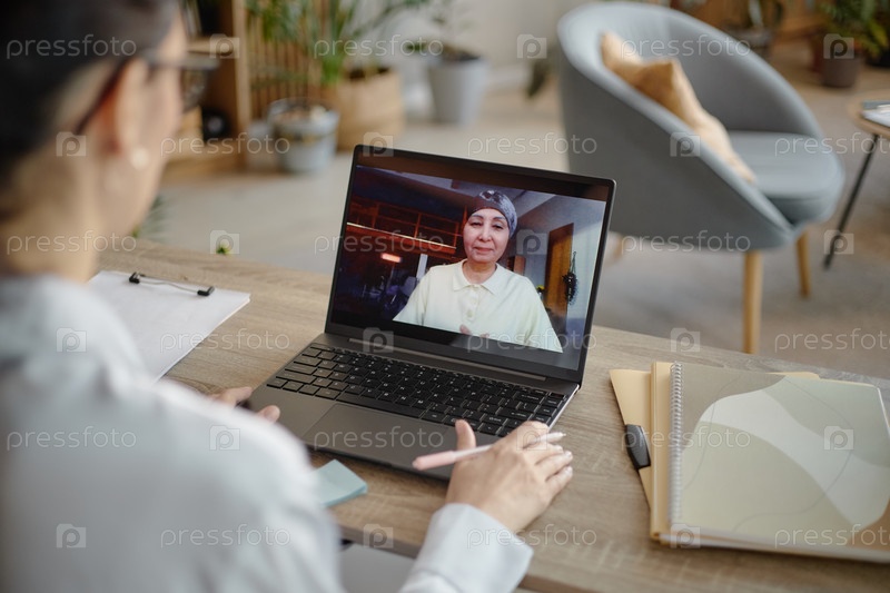 Женщина среднего возраста проводит онлайн-сессию терапии со старшим пациентом
