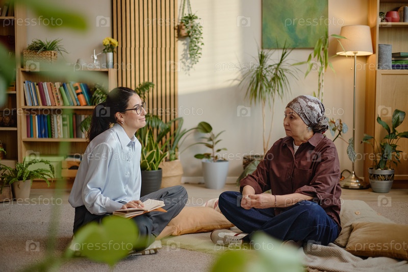 Кавказская женщина среднего возраста консультирует старшую женщину во время психологической сессии