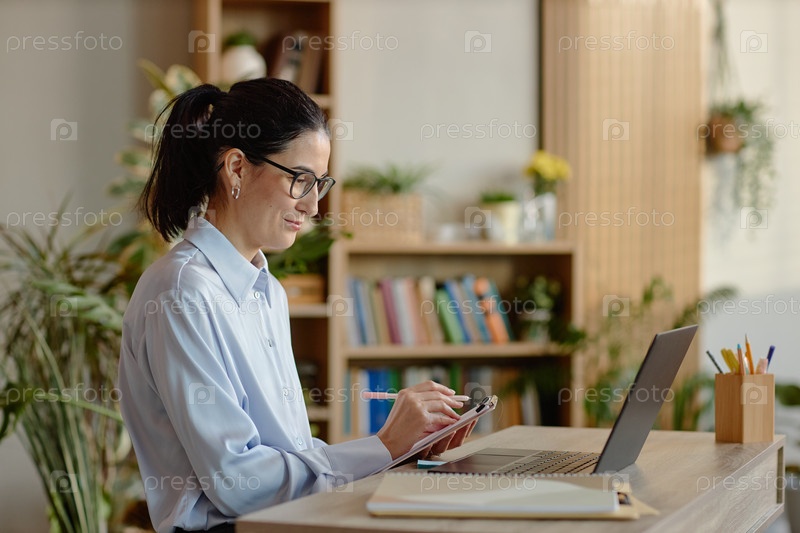 Кавказская молодая взрослая женщина пишет заметки, работая на ноутбуке в офисе