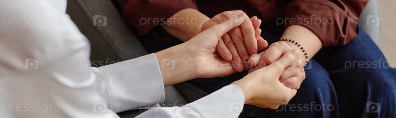 Женщина, держащая пожилую женщину за руки и предлагающая эмоциональную поддержку