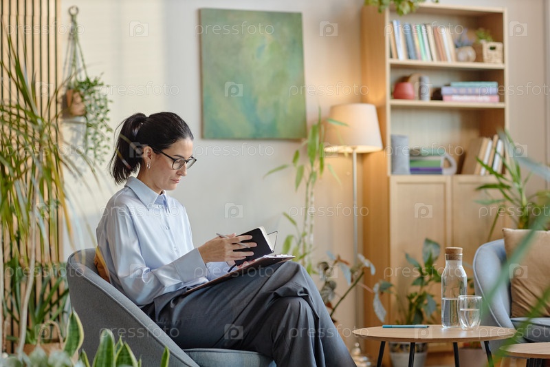 Кавказская женщина среднего возраста пишет заметки во время психологической консультации